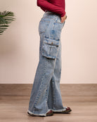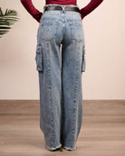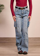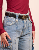 Tascone con gamba dritta fino al fondo con bordi sfrangiati. Alta vita con chiusura zip e bottone metallico, cintura in ecopelle inclusa.