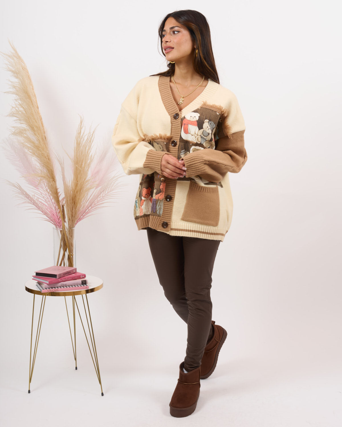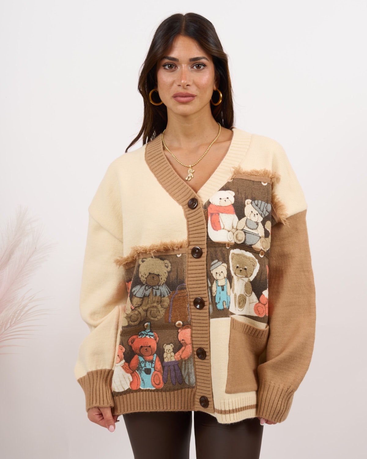 Maxi cardigan in lana, fantasia orsetti. In taglia unica veste fino a 50/52.