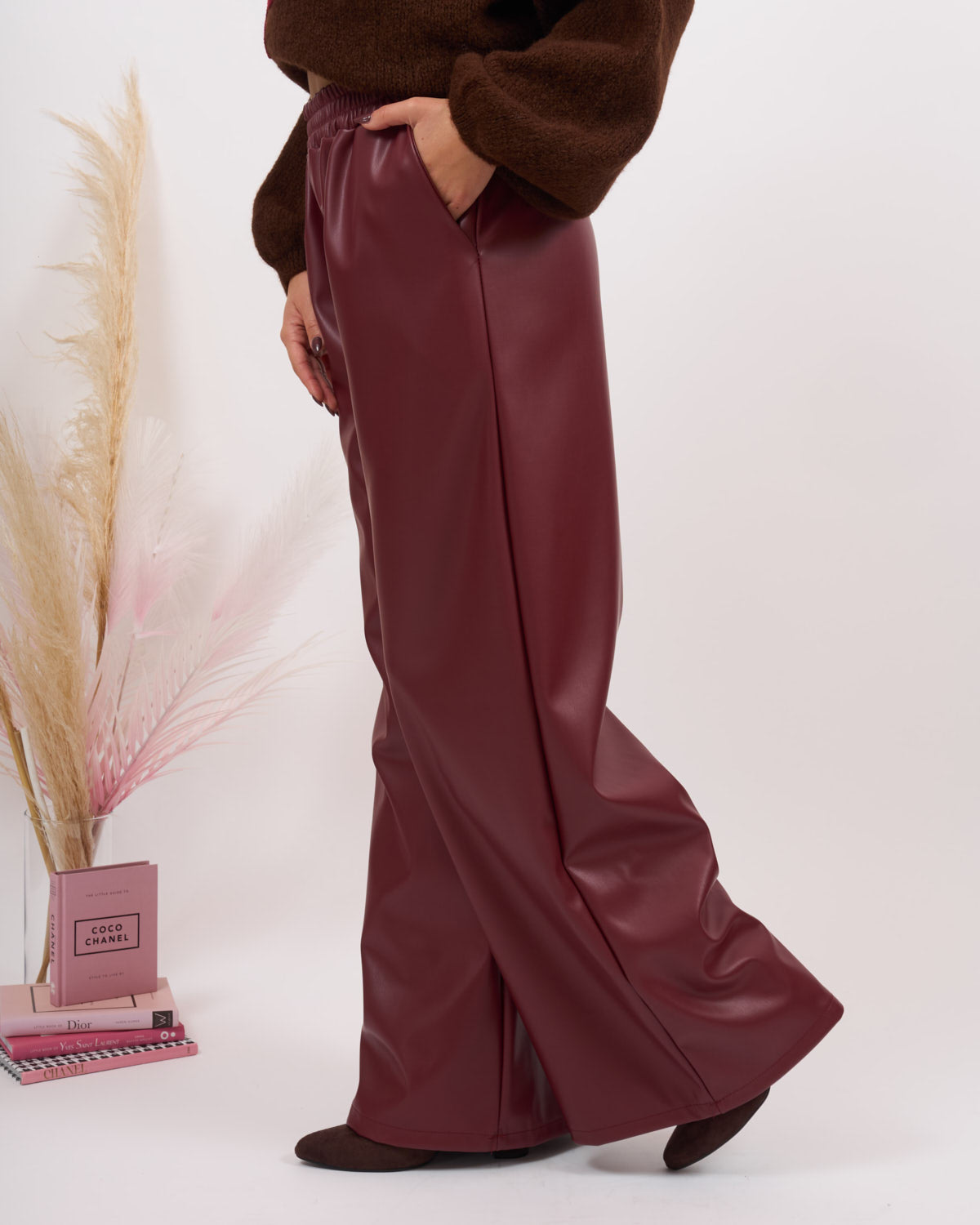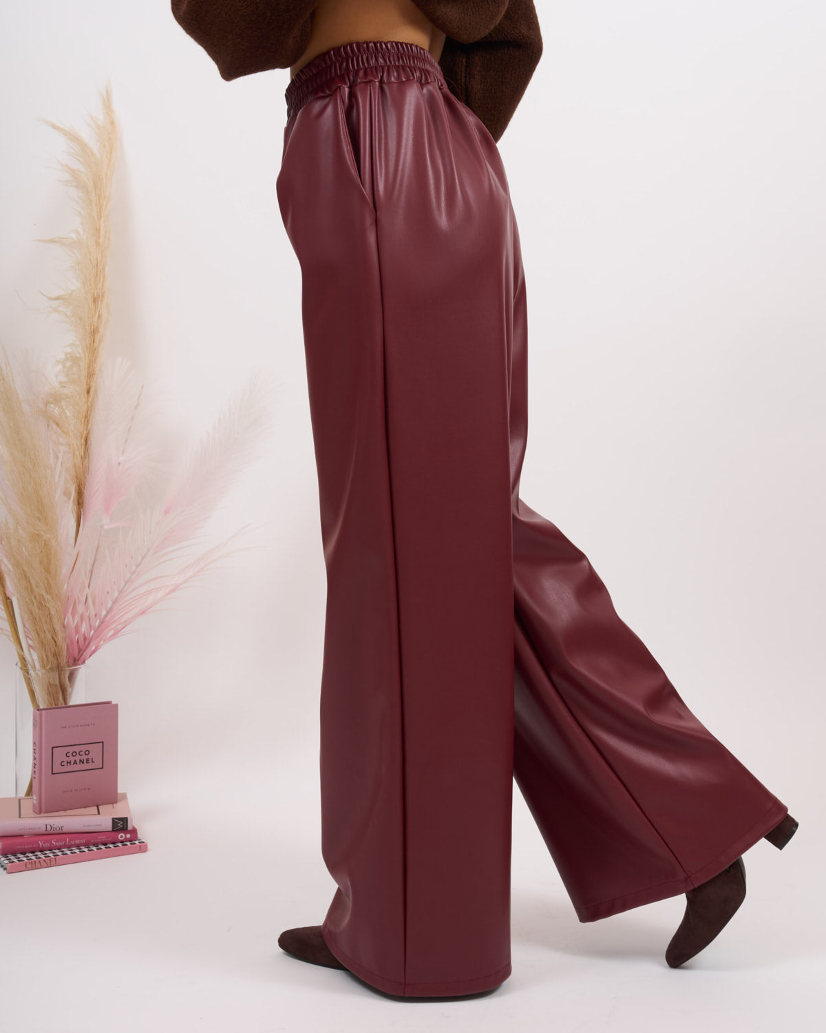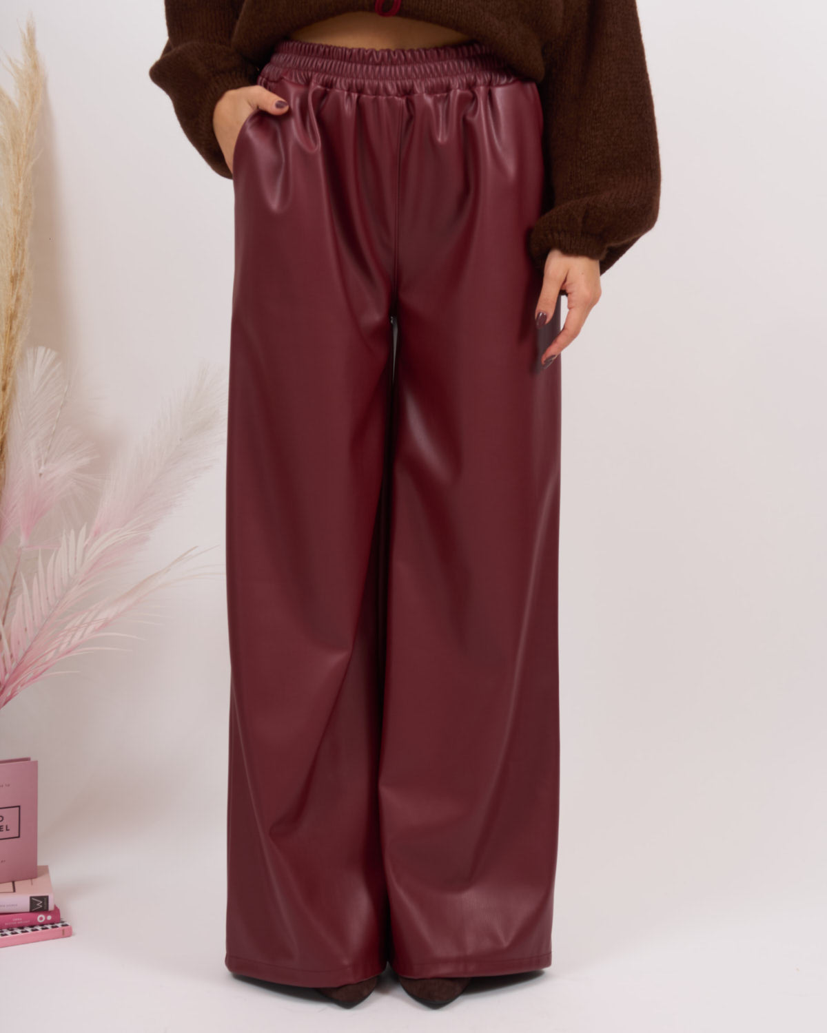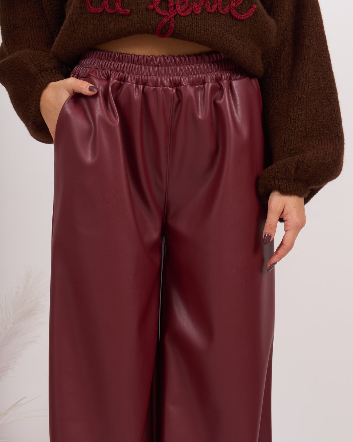 Pantalone modello palazzo, vita alta elasticizzata con tasche.