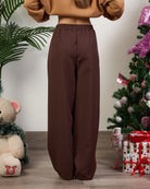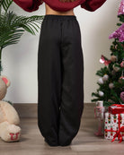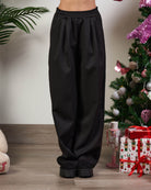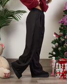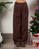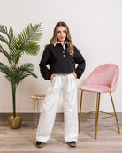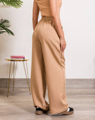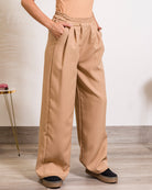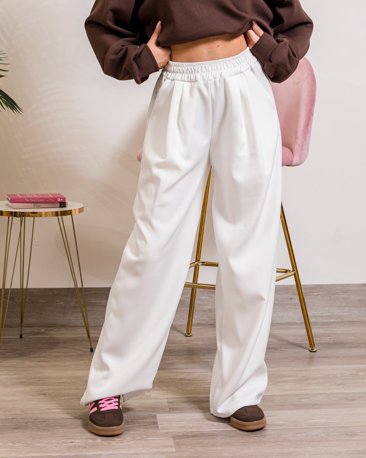Pantalone alta vita con pinces sul davanti, vita alta con elastico. Tasche laterali e gamba dritta fino al fondo.