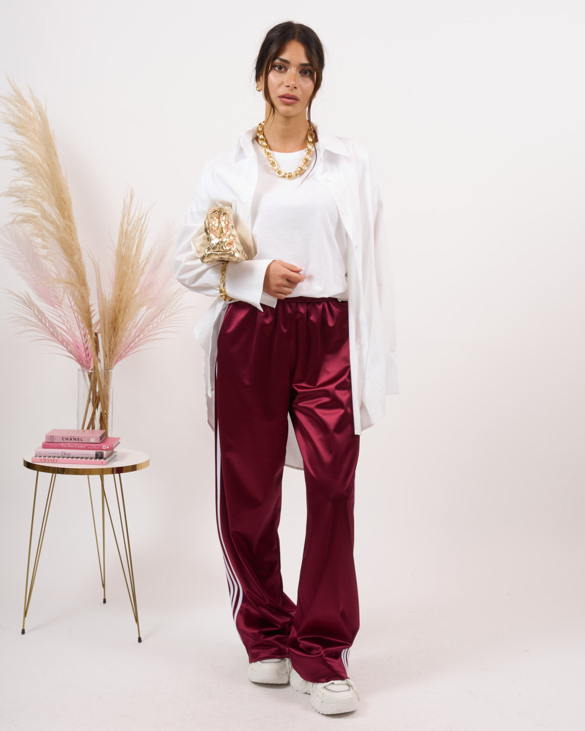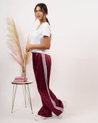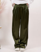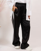 Pantalone effetto raso, alta vita con elastico e bande laterali.