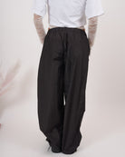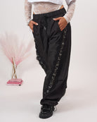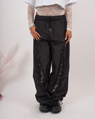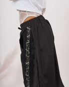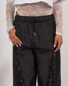 Pantalone in tela paracadute con fasce laterali bianche con pizzo.