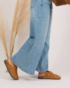 Sabot in pelle scamosciata con plateau comodo di circa 2 cm d’altezza, effetto sughero. La calzata è confortevole e fedele alla misura; per chi porta mezzo numero è consigliato scegliere quello superiore.