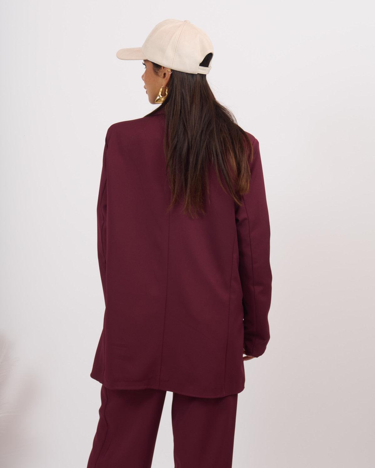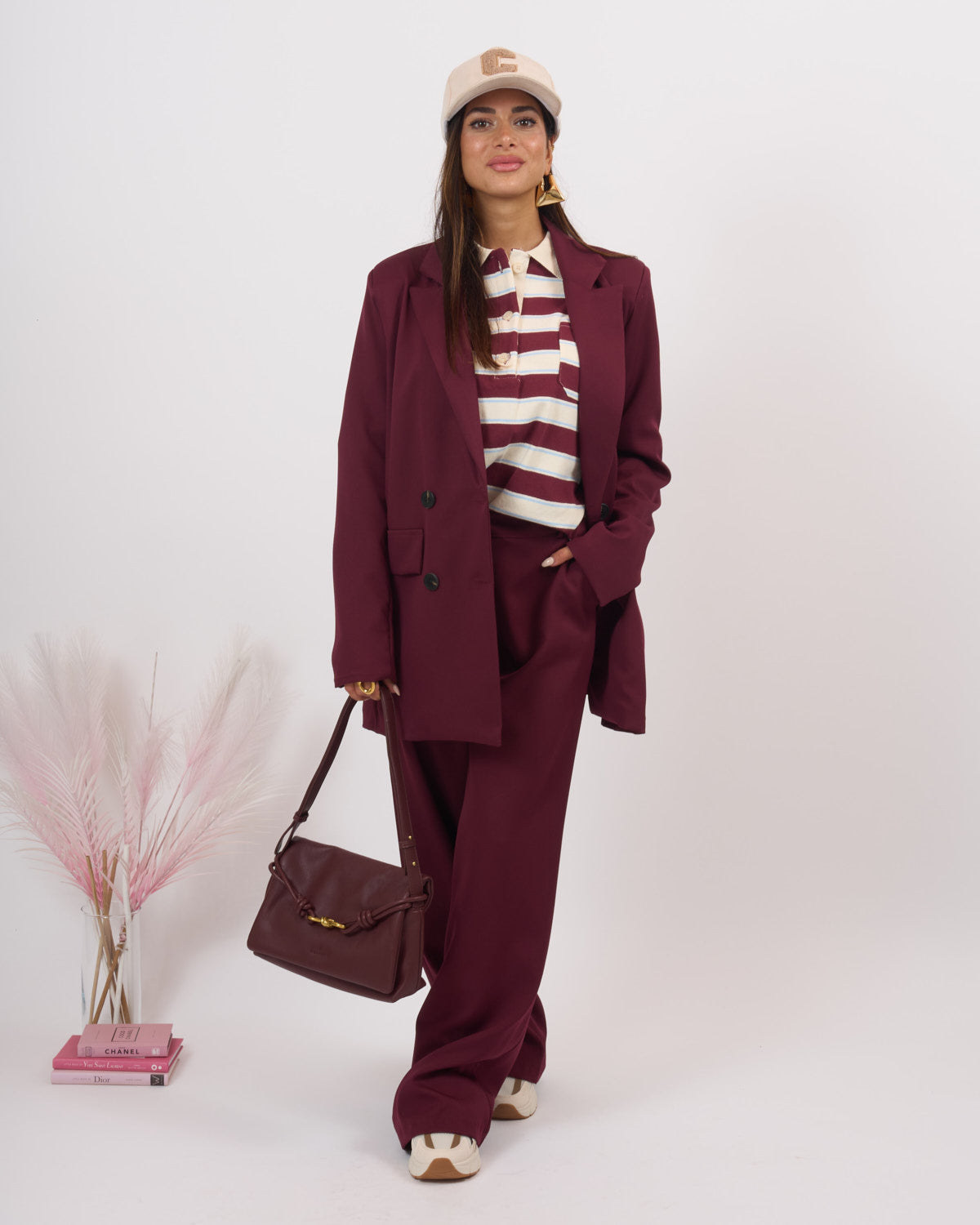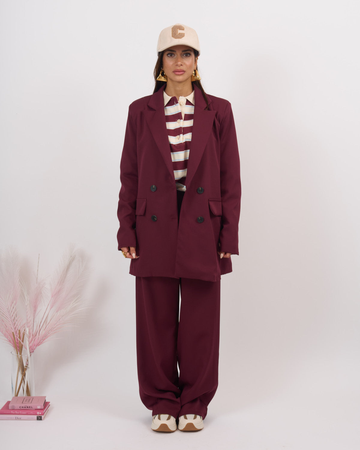 Tailleur doppiopetto composto da giacca modello oversize con interno foderato e spalline, pantalone vita alta con retro elasticizzato e gamba dritta fino al fondo.