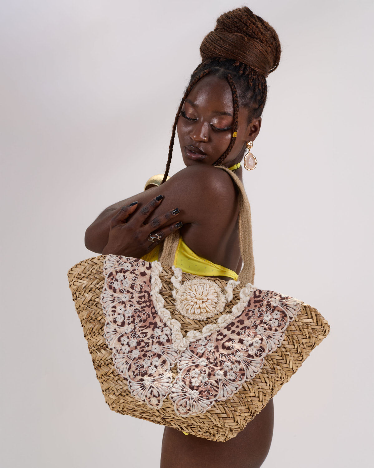 Paglia medio/grande realizzata con paglia intrecciata impreziosita con conchiglie, tessuto e ricami. Top quality