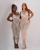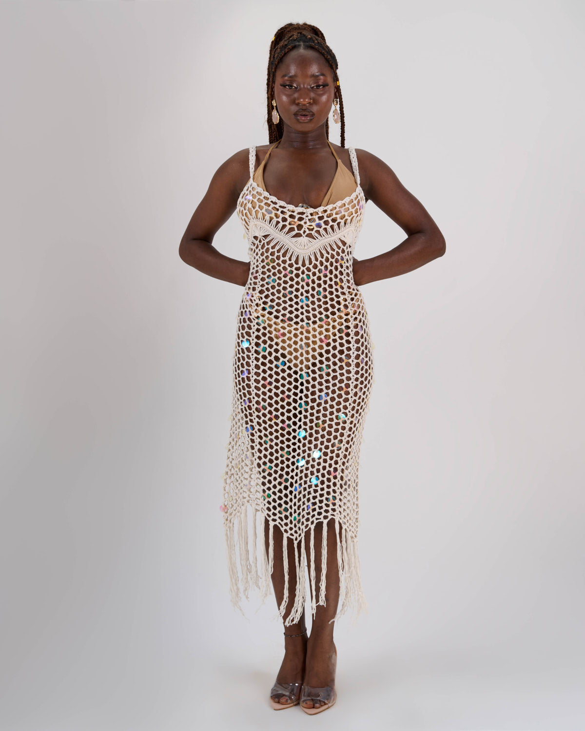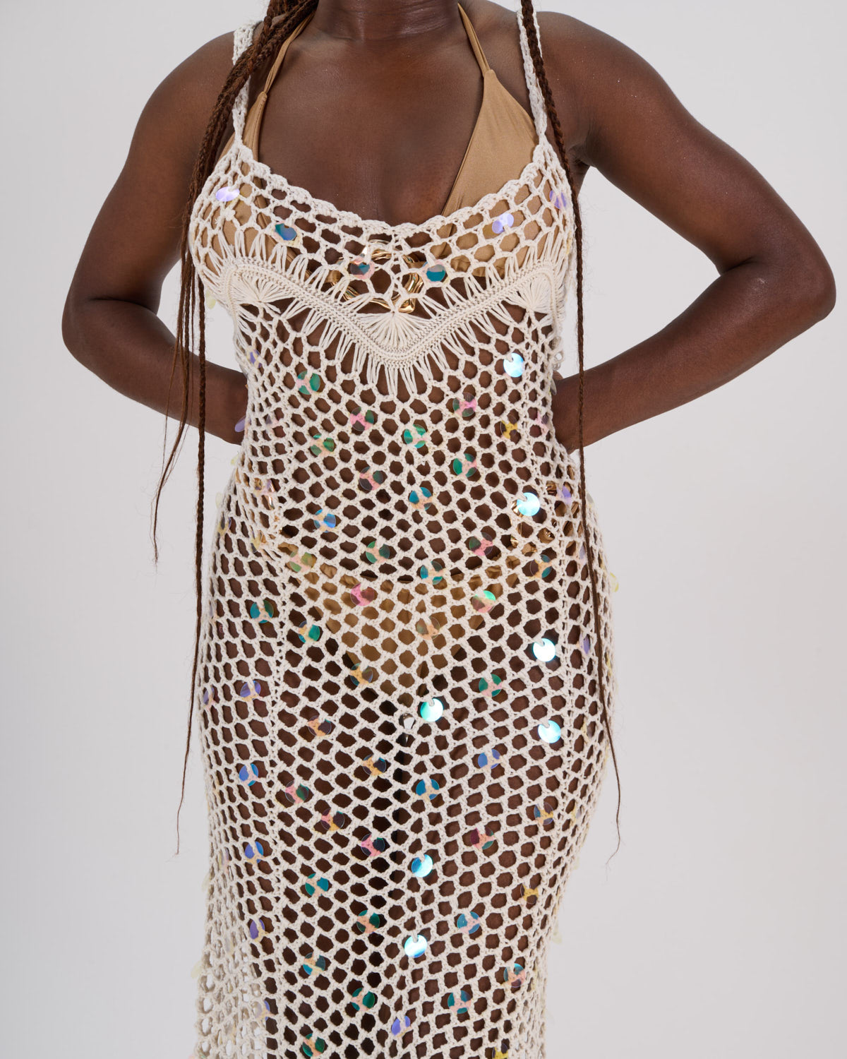Copricostume abito ad uncinetto con paillettes cucite multicolor.