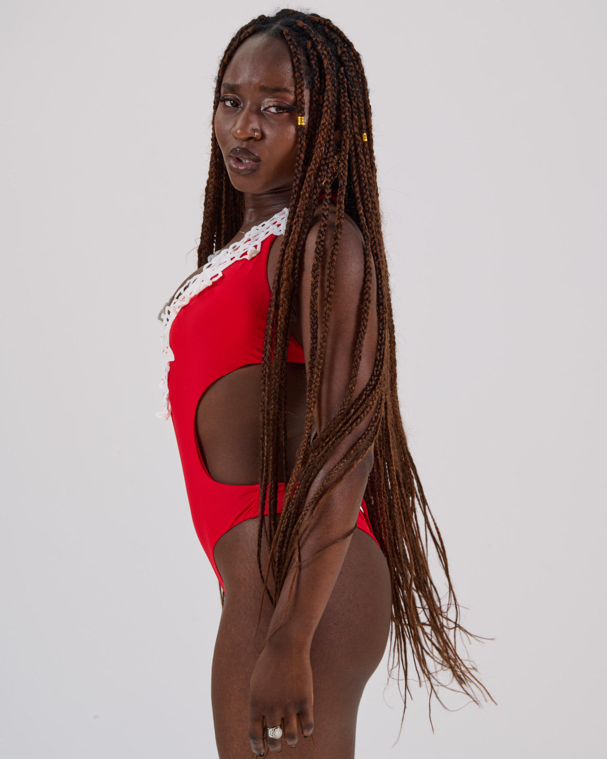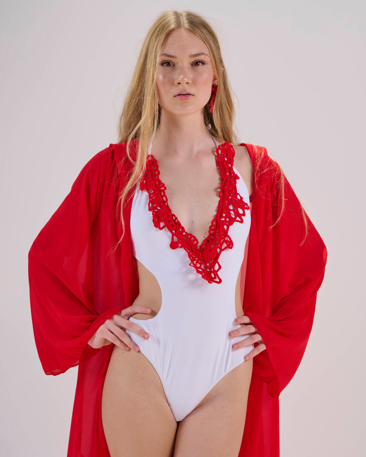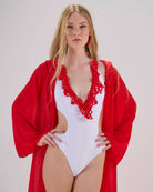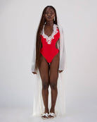 La modella costume rosso indossa taglia S/42.