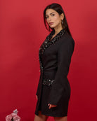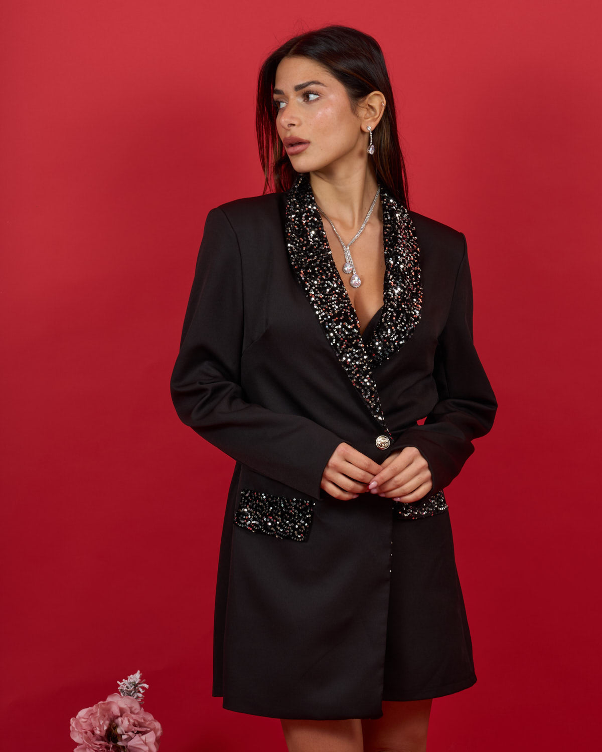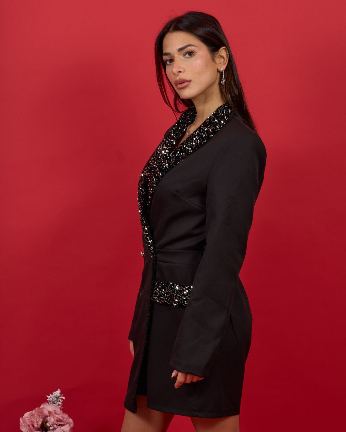 Abito giacca con shorts, retro elasticizzato e revers con paillettes.