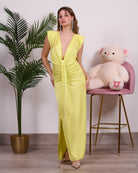 Abito con scollo sul davanti e drappeggio. Spacco laterale non profondo.