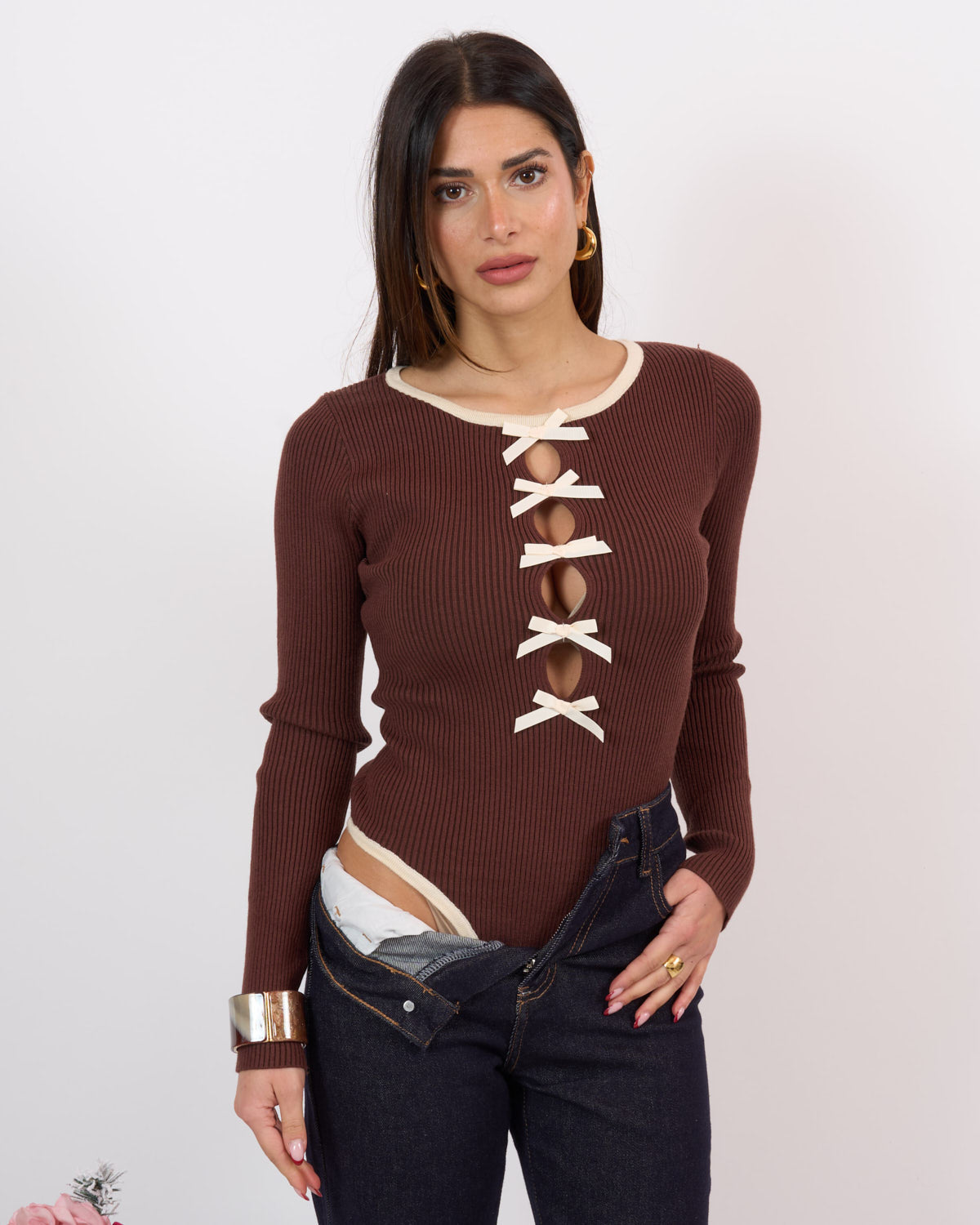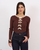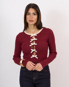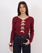 Body a costine elasticizzato con scollo impreziosito da fiocchetti cuciti.