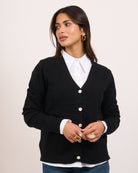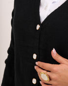In lana rasata elasticizzata con bottoni colore perla e oro.