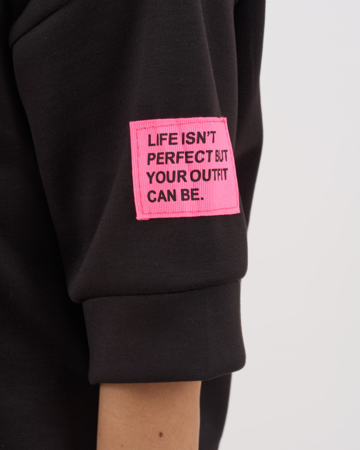 Coordinato composto da maglia girocollo con pantalone alta vita elasticizzata con lacci regolabili. Con patch di cotone cucita.