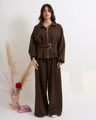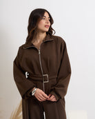 In morbida viscosa elasticizzata (di qualità) composto da blusa con zip e pantalone alta vita elasticizzata.