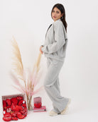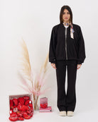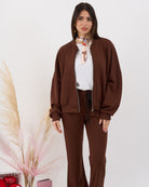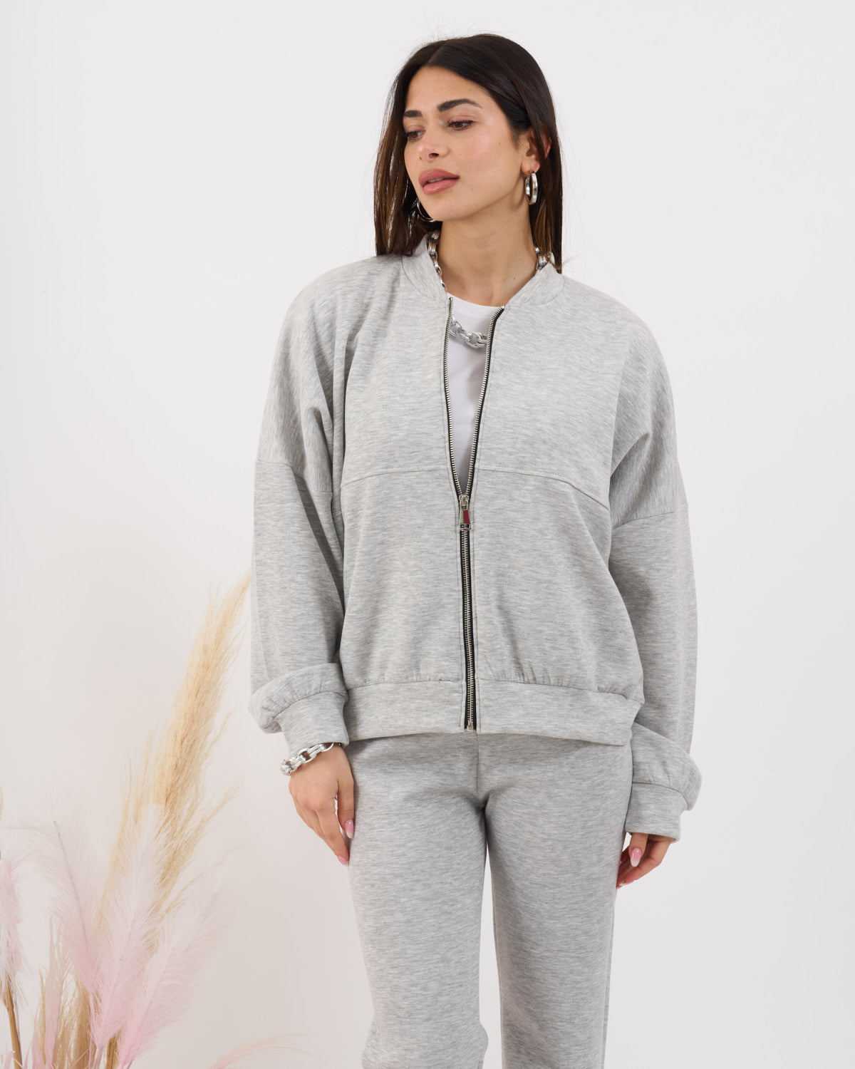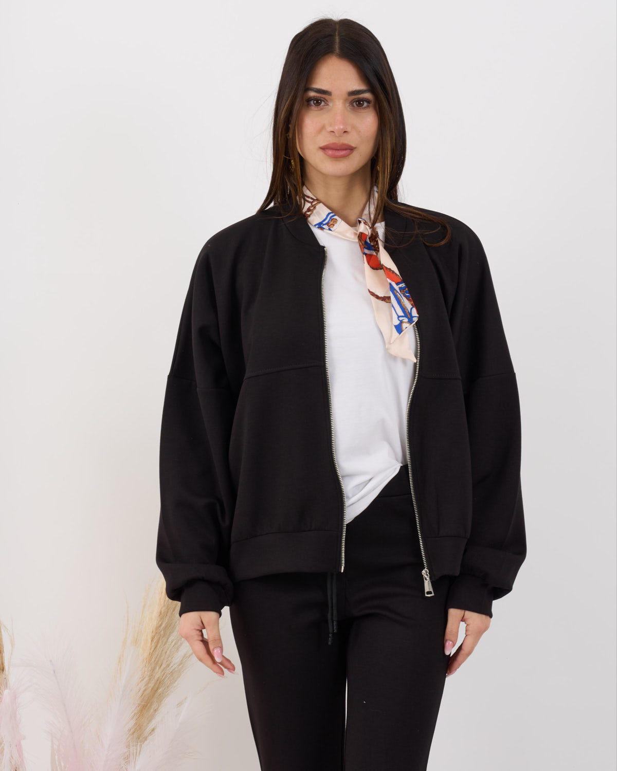 Coordinato composto da blusa con zip e pantalone alta vita elasticizzata con gamba leggermente a zampetta. Al tatto morbido e liscio effetto viscosa.