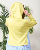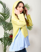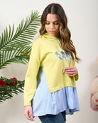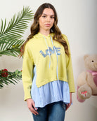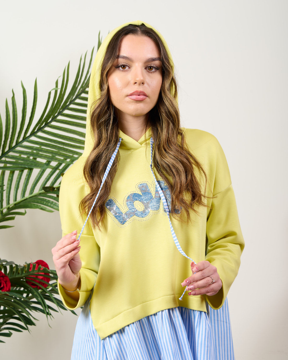 Felpa con cappuccio e bordo in camicia a righe. Scritta "love" sul davanti con paillettes