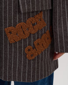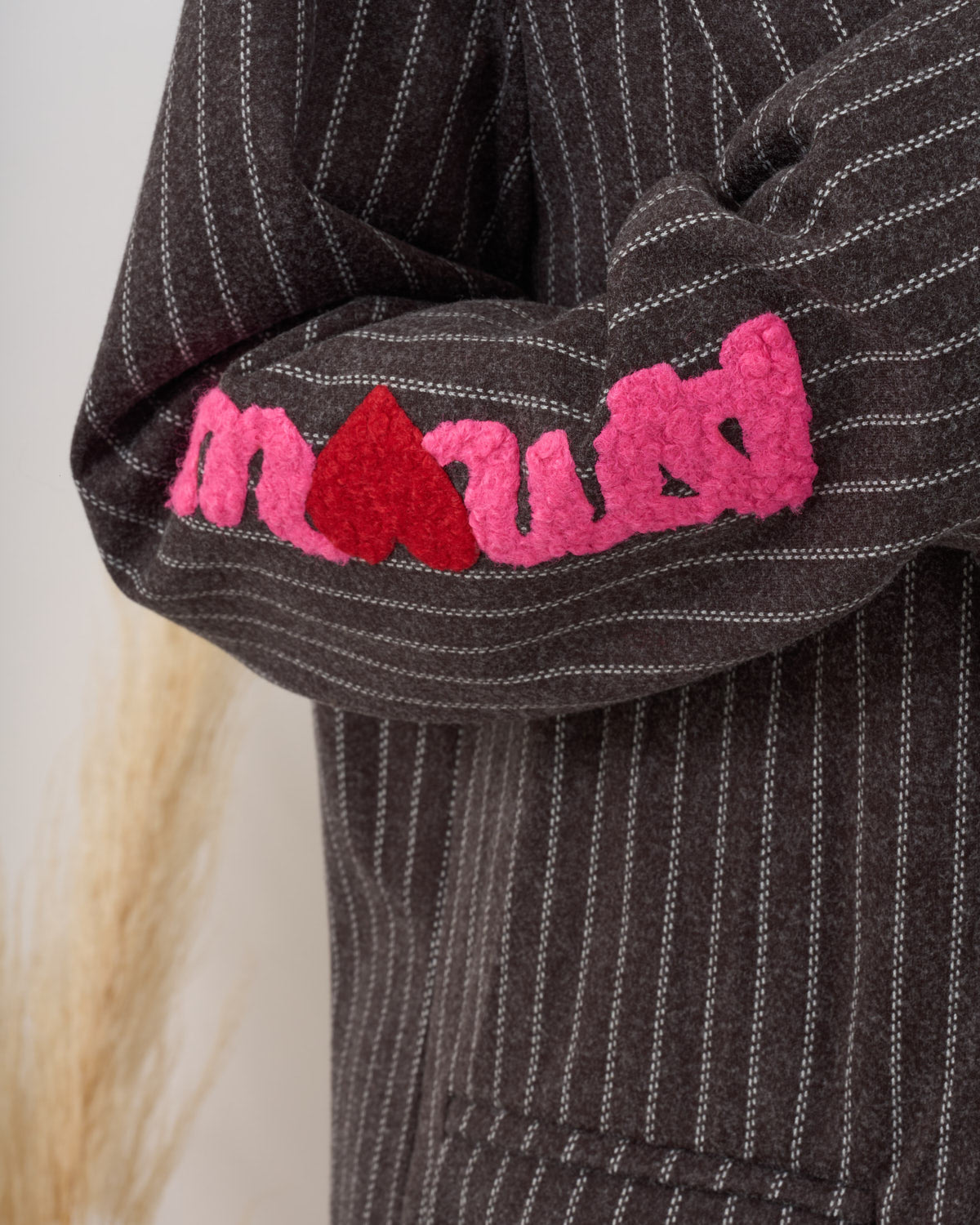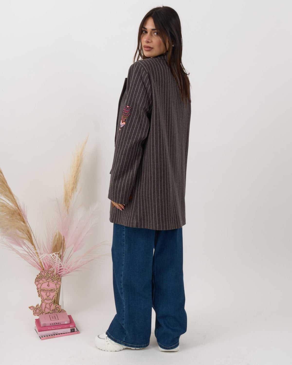 Giacca fantasia righe con patch cucite sul davanti, interno foderato e spalline.