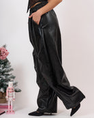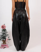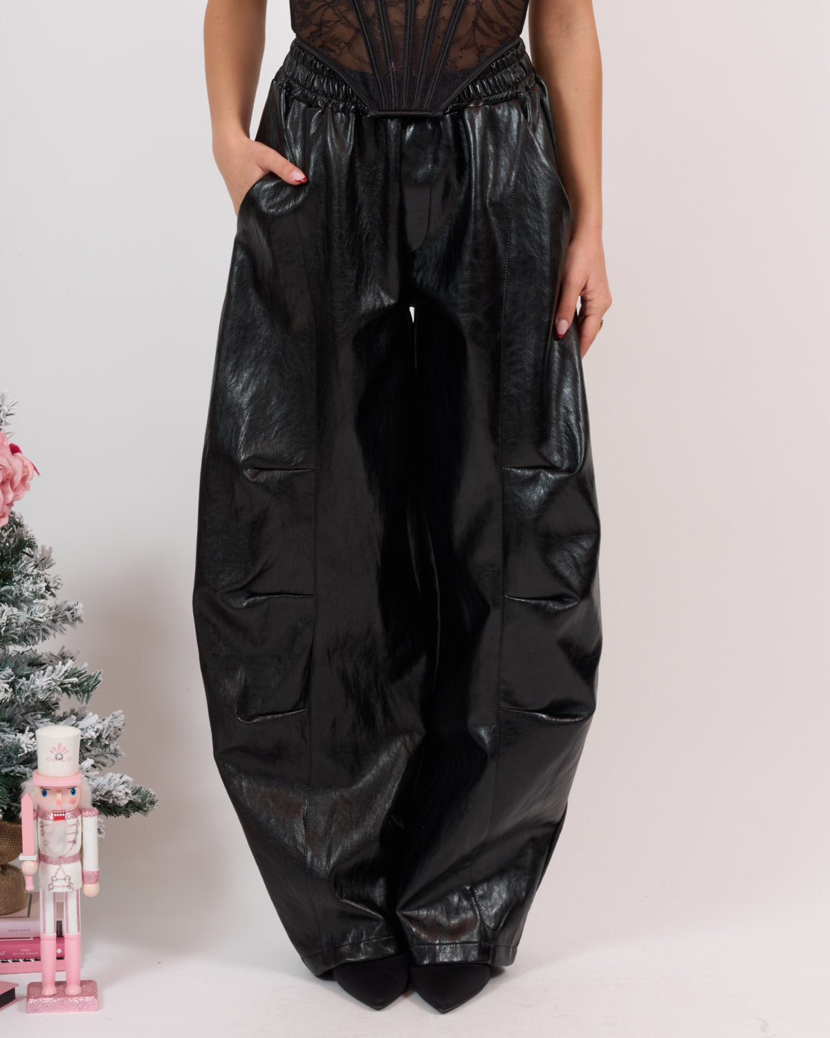 In morbida ecopelle di qualità effetto stropicciato, alta vita con lacci regolabili.