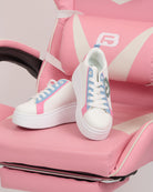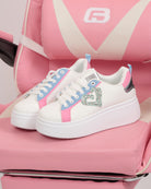 Realizzate in ecopelle bianca, queste scarpette presentano un plateau in gomma antiscivolo alto circa 4-5 cm. Sono arricchite da eleganti dettagli rosa e celesti impreziositi da strass sul lato esterno della tomaia, per un tocco di brillantezza che non passa inosservato.