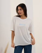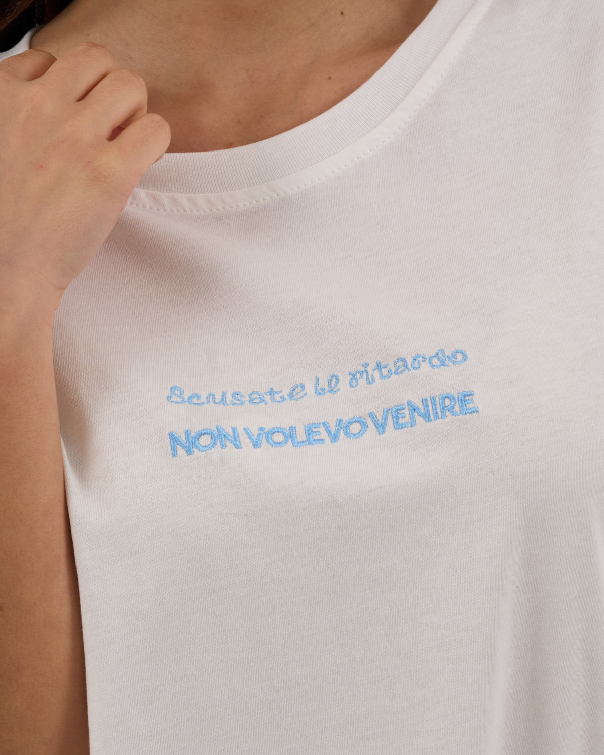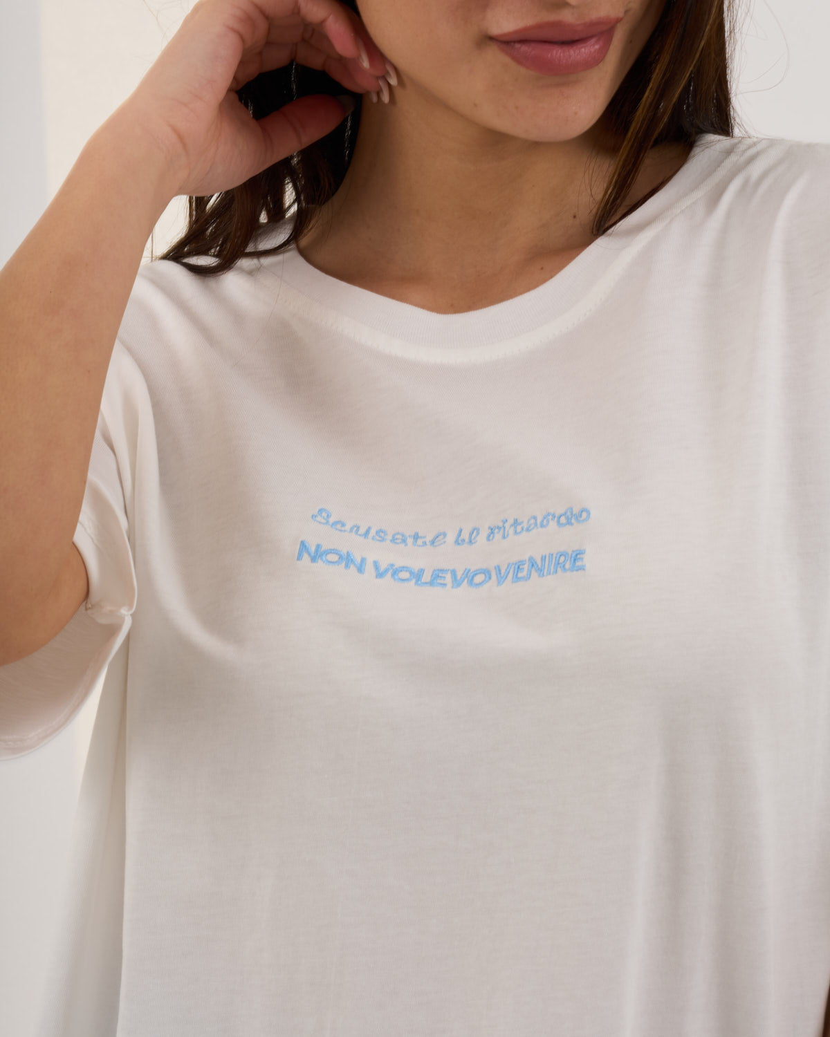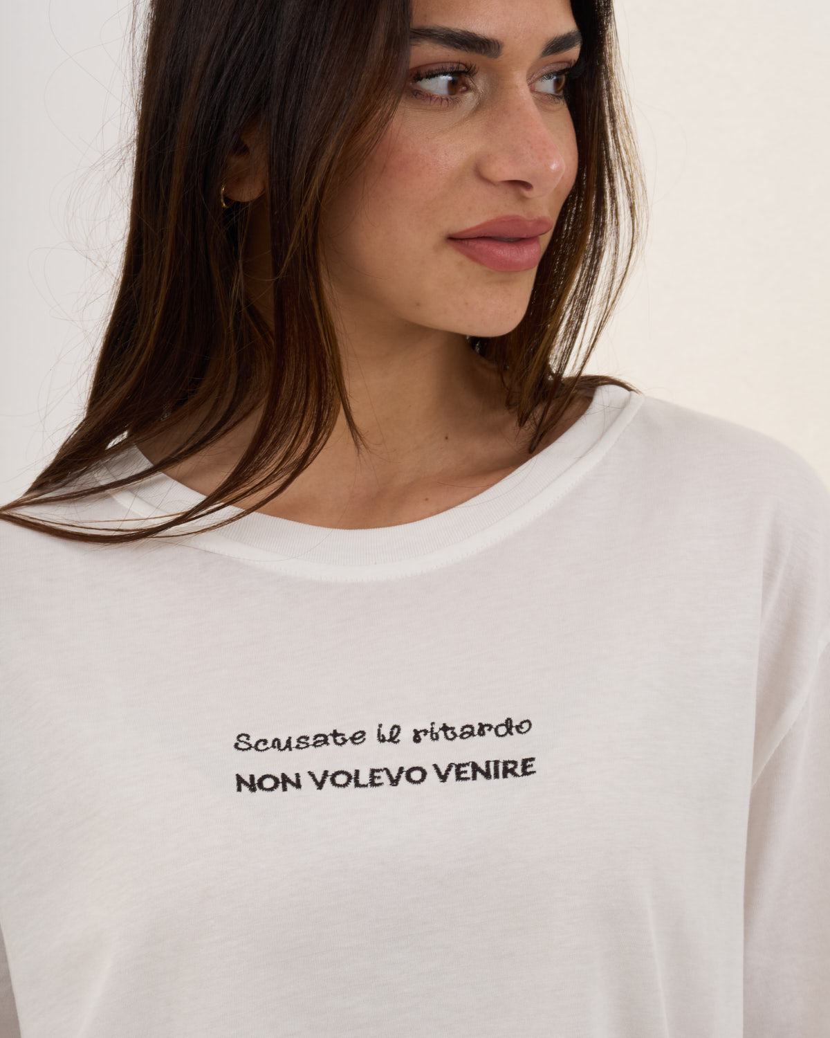 Maglia mezza manica in cotone, modello non aderente con scritta ricamata sul davanti.