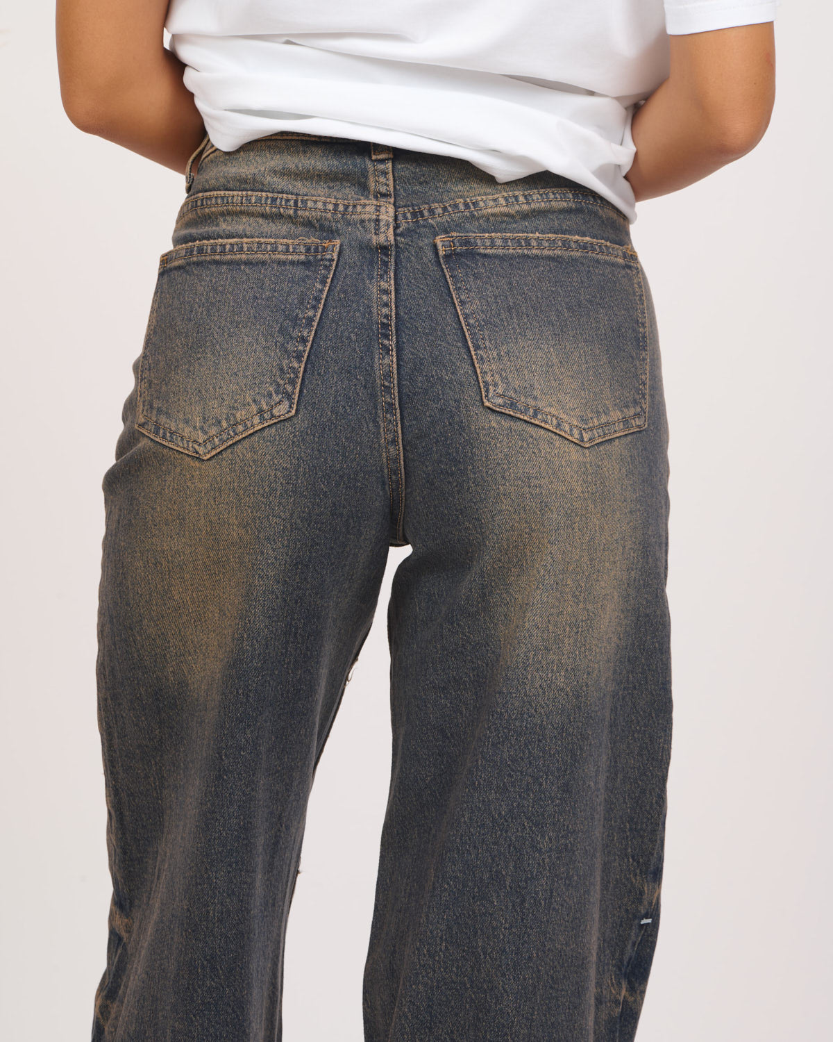 In denim elasticizzato realizzato con un lavaggio sfumato sui toni del marrone/beige e camel.