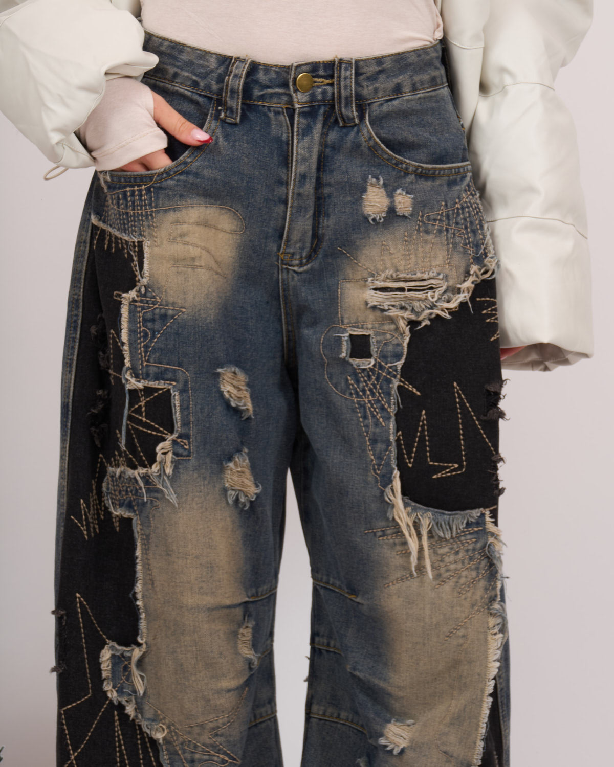 Jeans particolare con sfumature sabbia e finte toppe sul davanti.
