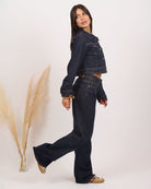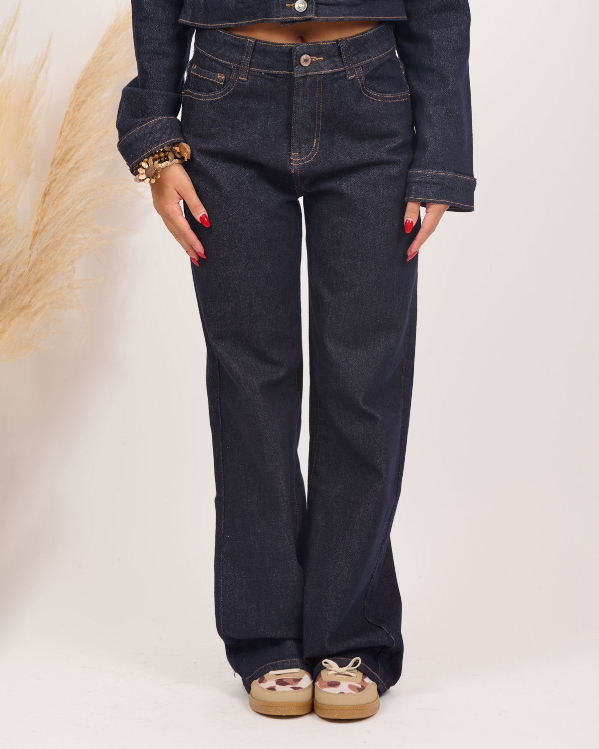 Elasticizzato lavaggio scuro, alta vita con tasche.