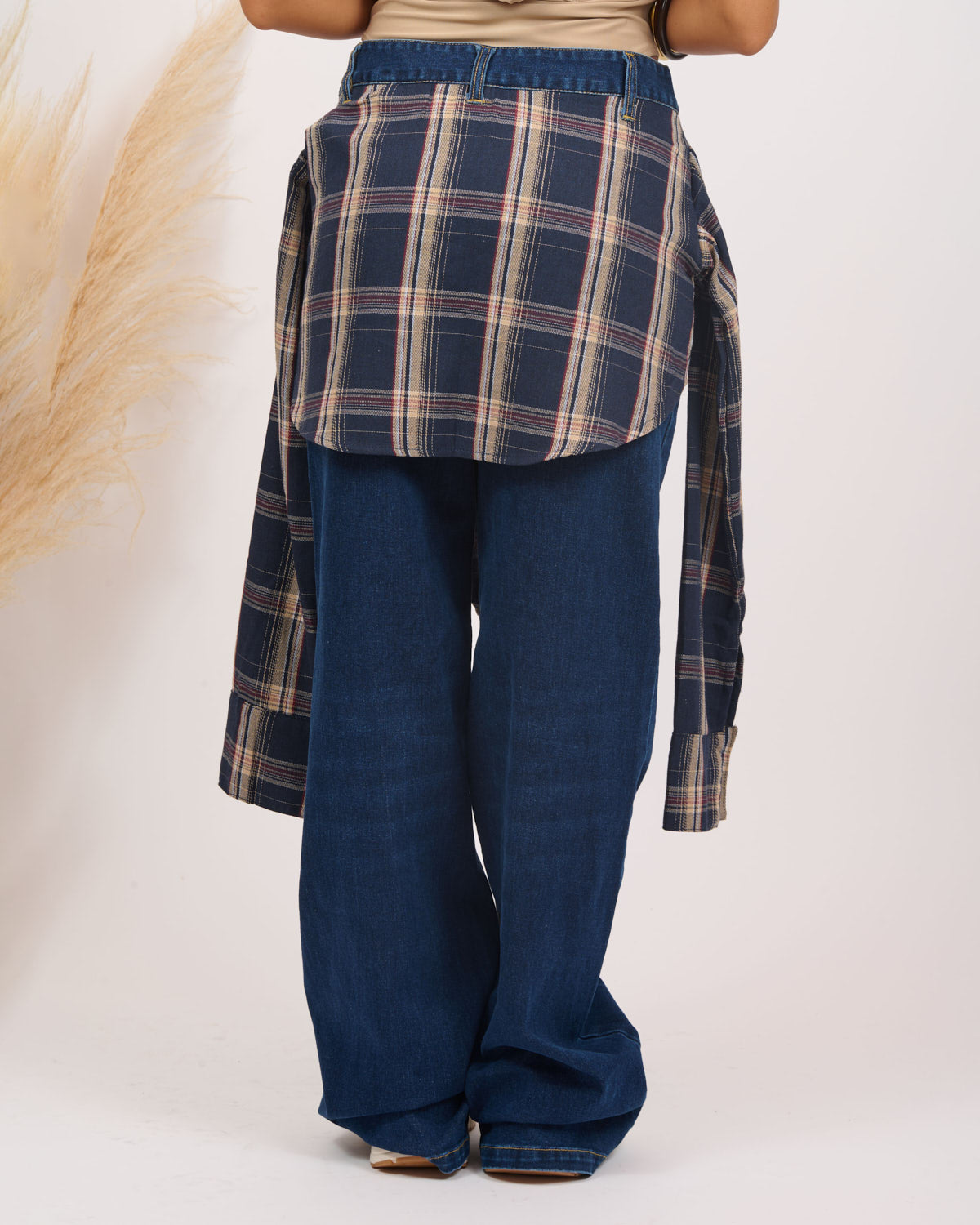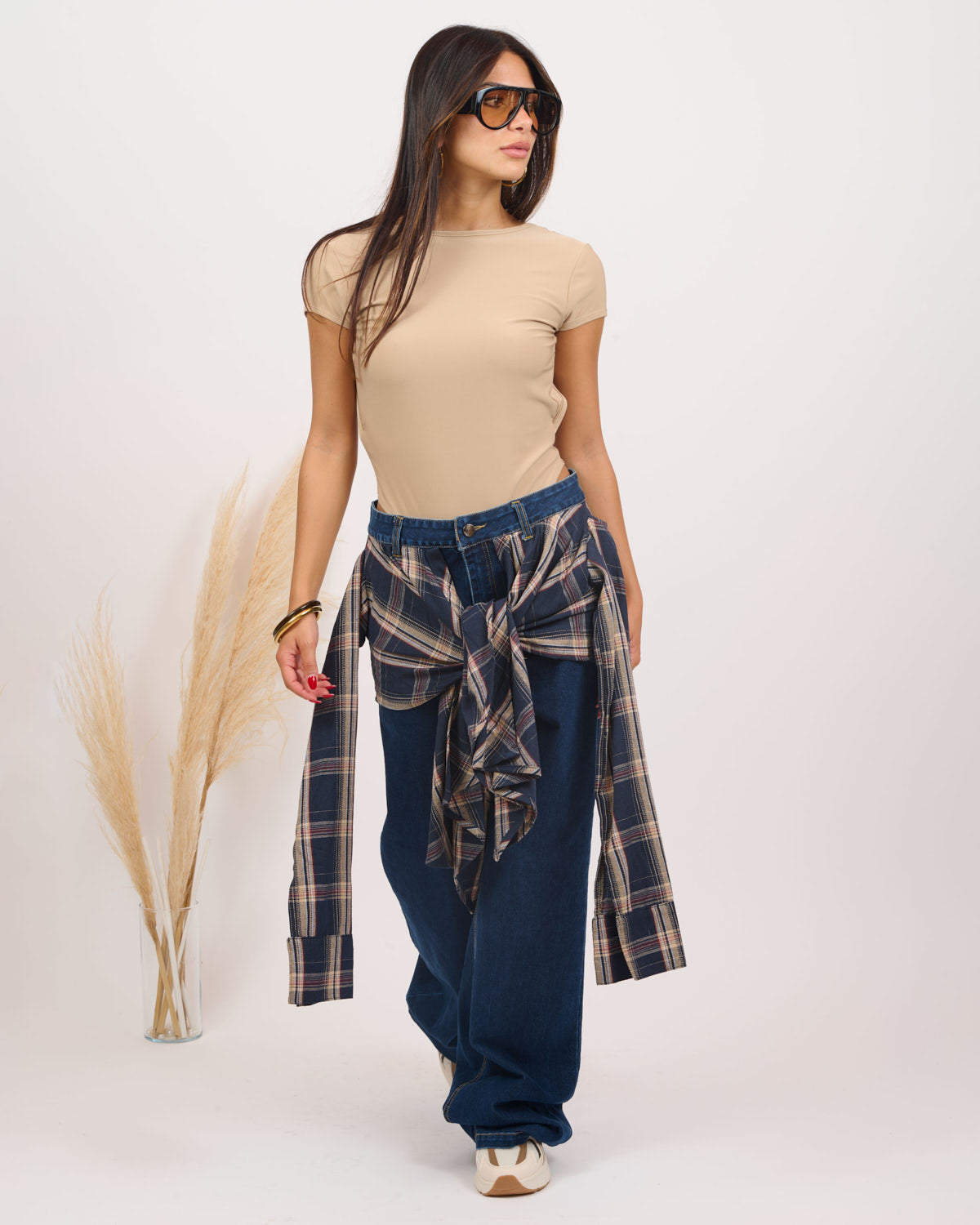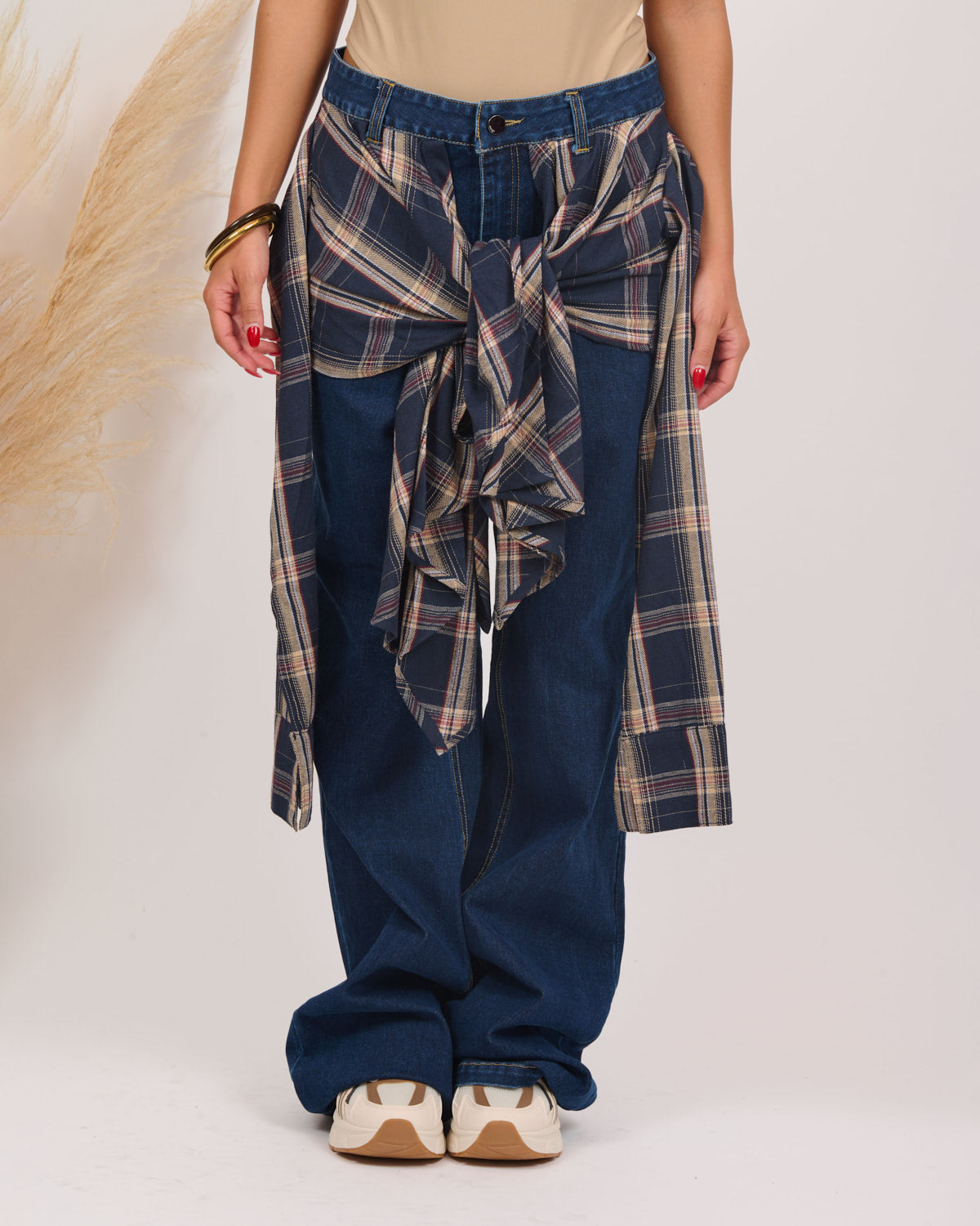 Jeans con finta camicia annodata, alta vita con gamba dritta fino al fondo.