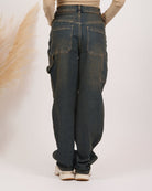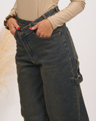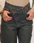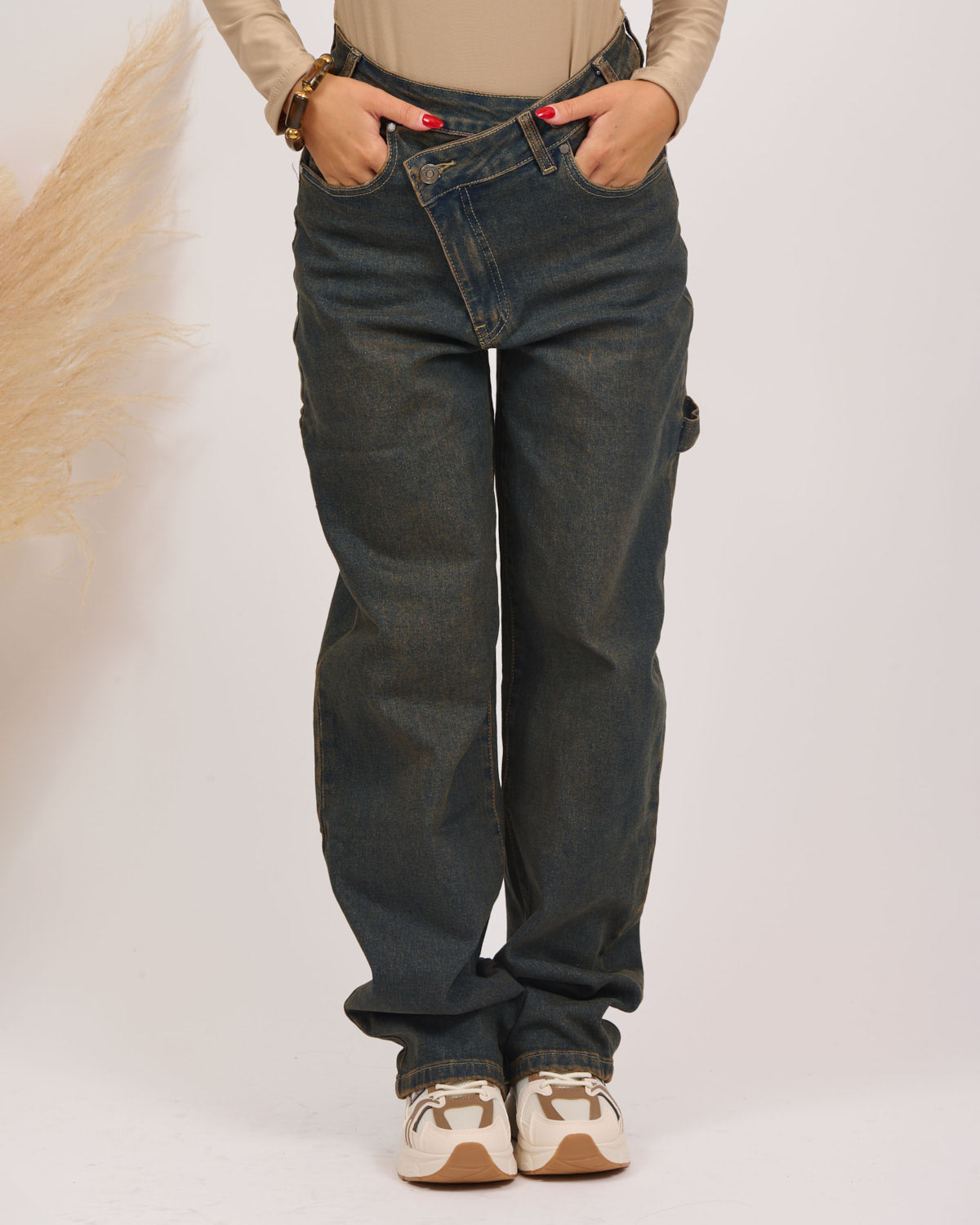 In denim elasticizzato in lavaggio sabbiato, abbottonatura sul davanti ad incrocio.
