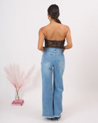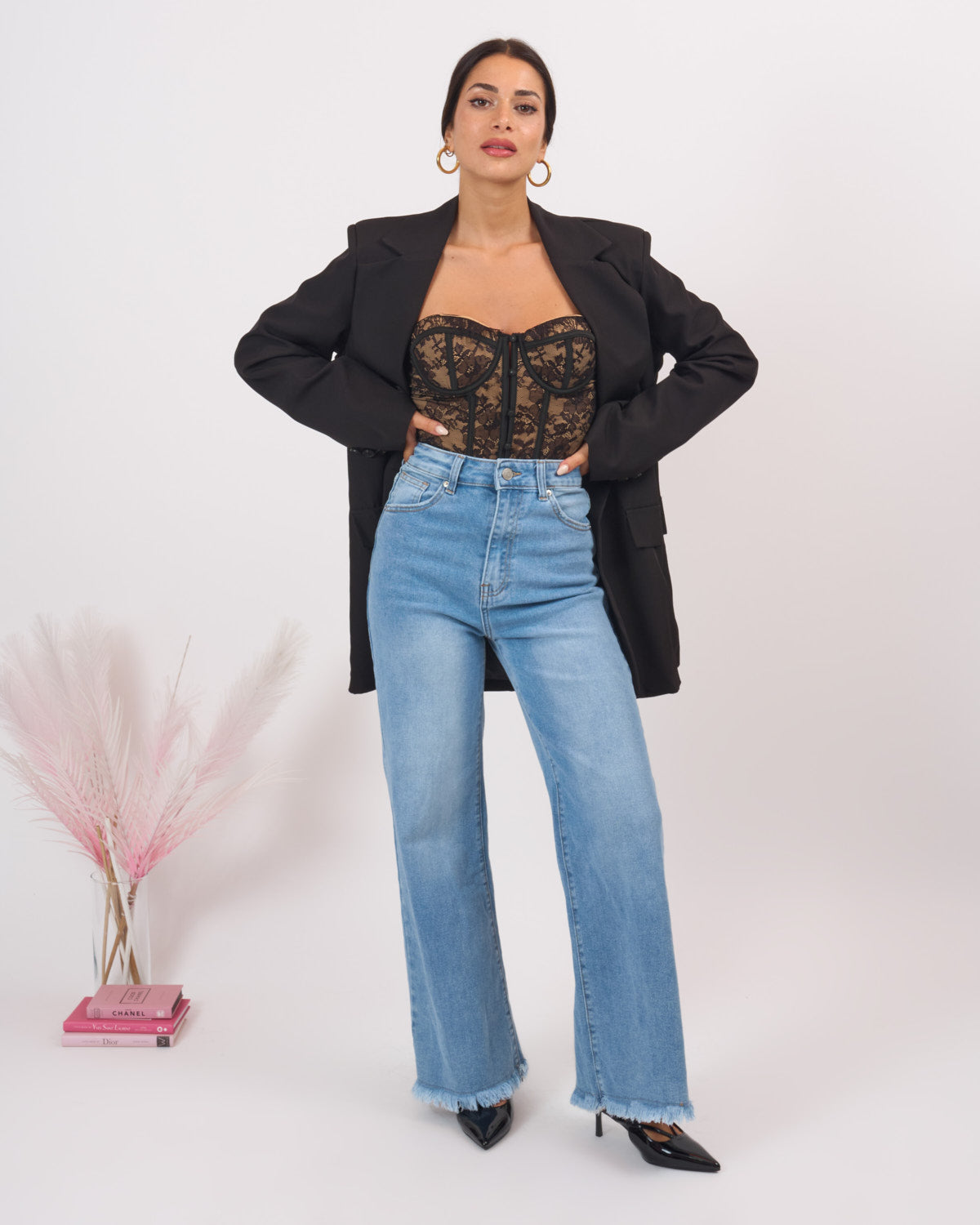 In tessuto elasticizzato, alta vita con gamba dritta fino al fondo.