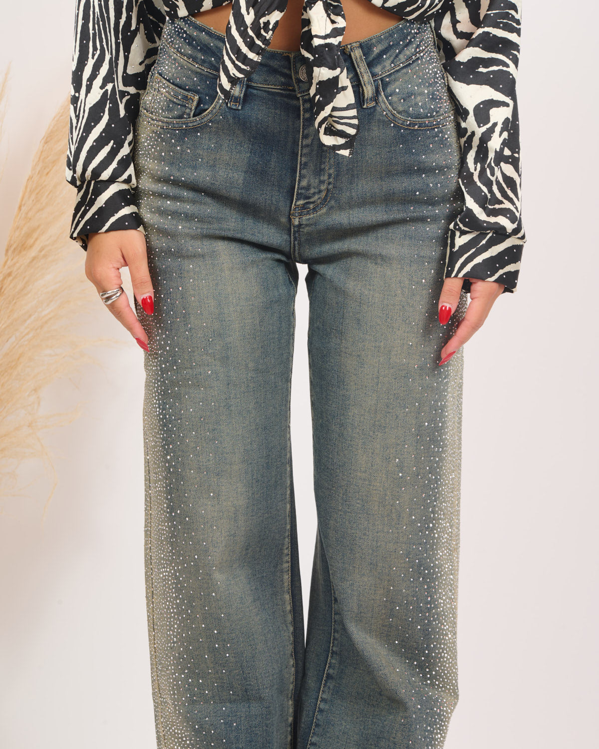 I jeans palazzo in denim elasticizzato si distinguono per le delicate sfumature sabbia arricchite da scintillanti dettagli lungo i fianchi fino all’orlo, conferendo un tocco di eleganza e originalità al tuo look.