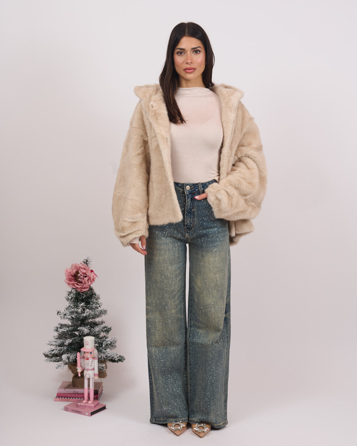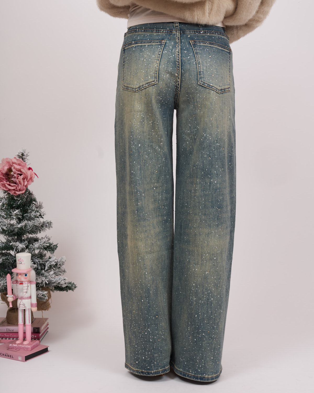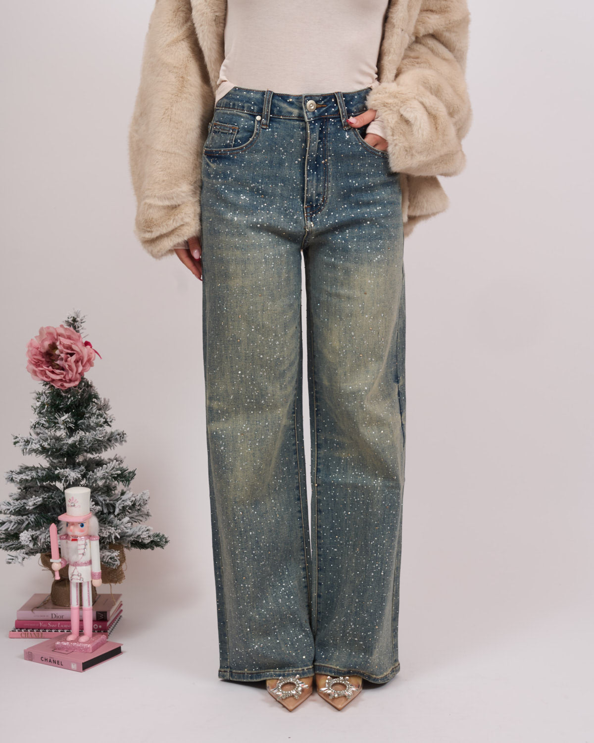 Jeans lavaggio medio/scuro con sfumature sabbia e brillantini.