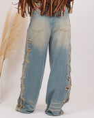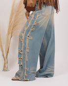 Jeans a gamba dritta con dettagli di abrasioni laterali e un raffinato lavaggio sabbiato. La vita alta in denim leggermente stretch assicura comfort e stile in ogni occasione.
