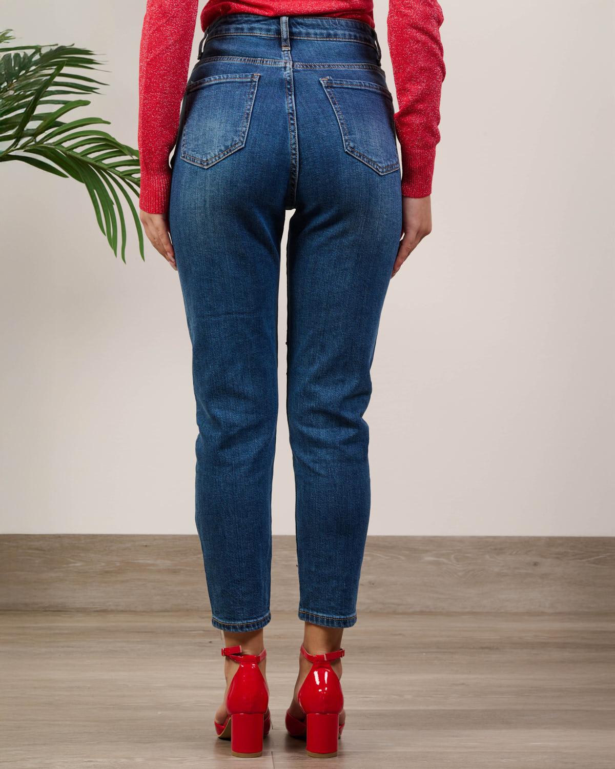 jeans elasticizzato alta vita con chiusura zip e bottone metallico. Vestibilità aderente