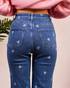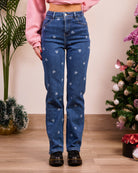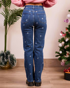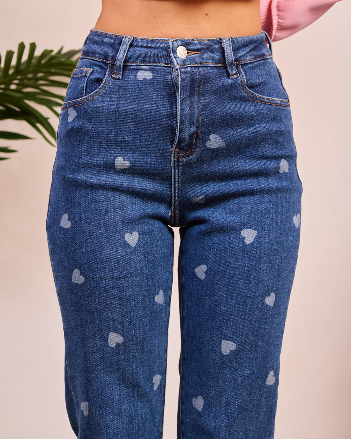 Modello palazzo in denim elasticizzato. Chiusura zip e bottone metallico, alta vita.