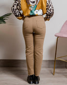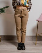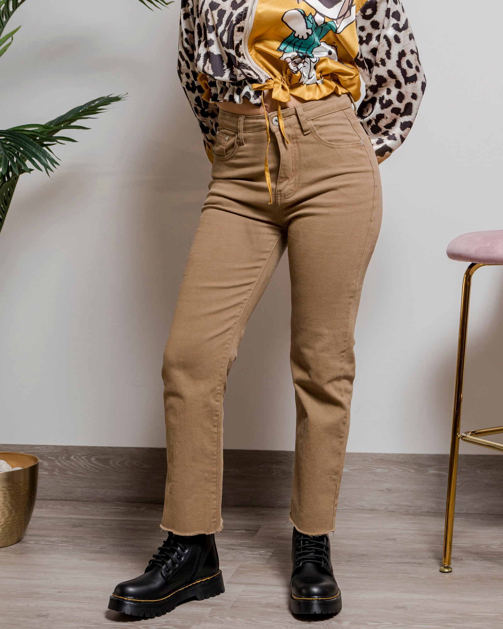 In bull denim elasticizzato, alta vita con chiusura zip e bottone metallico. Gamba dritta fino al fondo, orlo sfrangiato. Vestibilità regolare. ( La modella indossa una taglia S, alta 171cm)