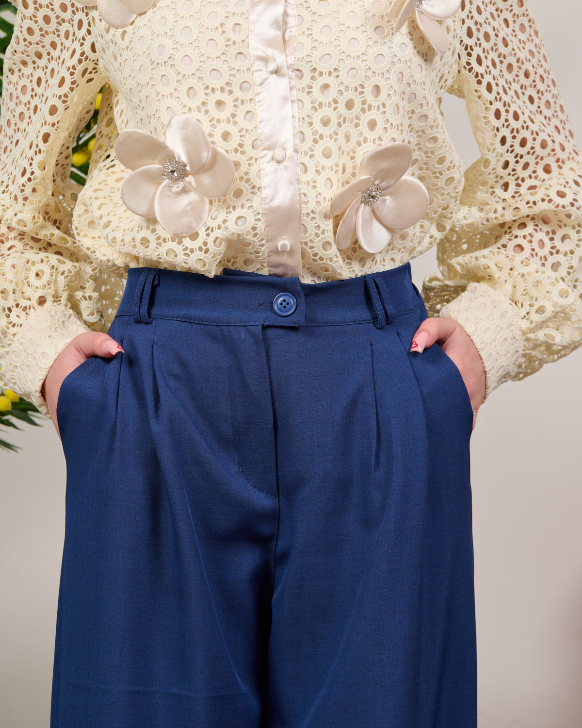 Palazzo modello palazzo vita alta con chiusura zip e bottone.