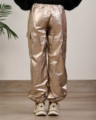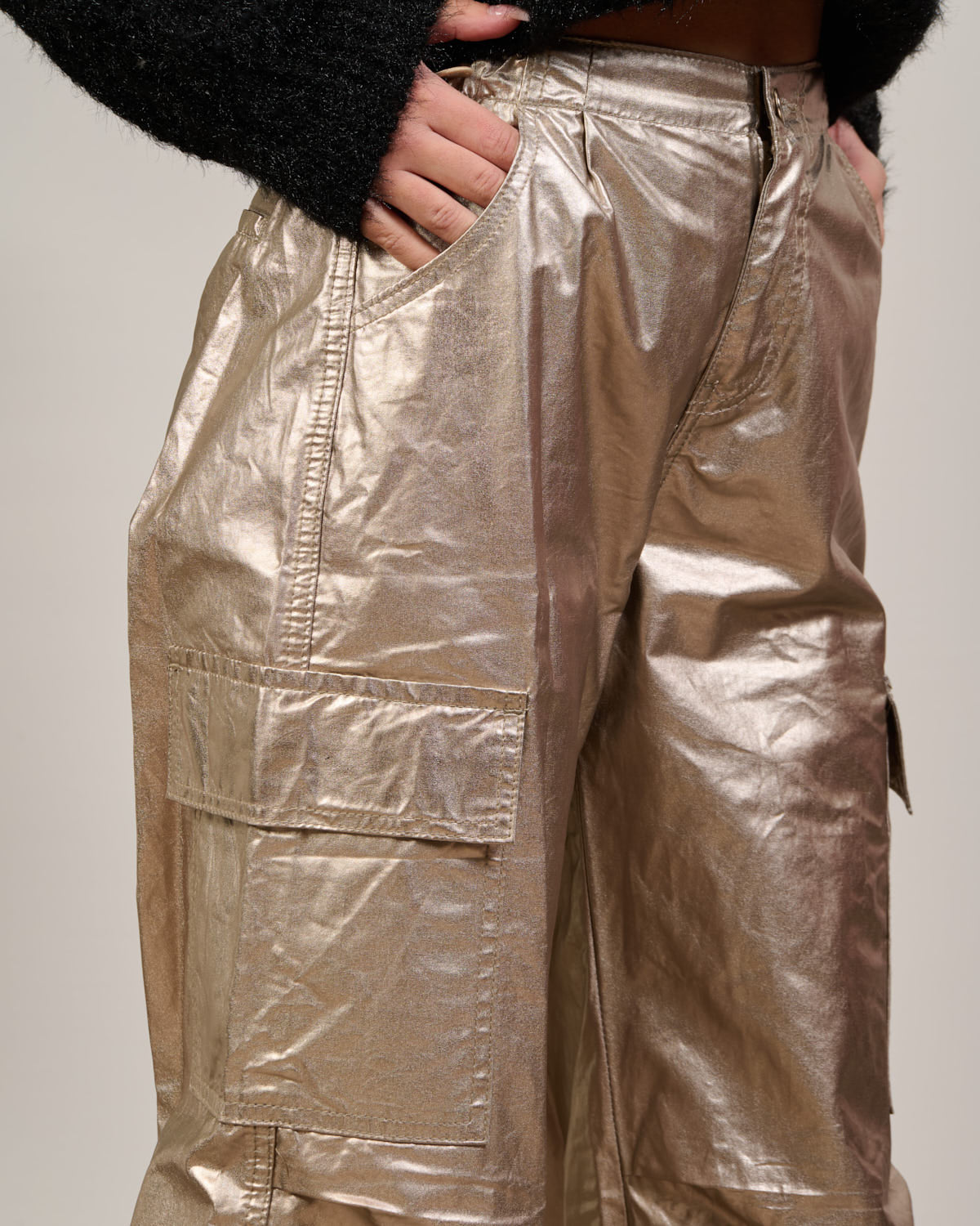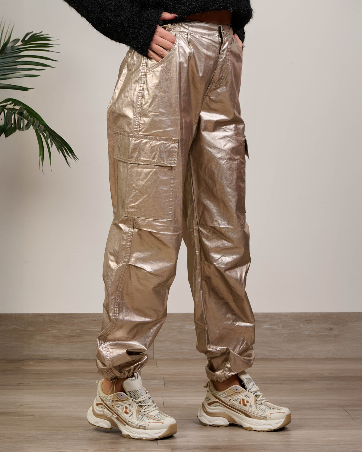 Pantalone modello parachute in tessuto metallico con polsini regolabili alle caviglie e in vita. Alta vita, fit regular. Chiusura zip sul davanti e bottone.