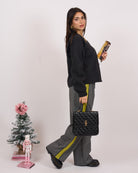 Tessuto caldo al tatto fantasia spigata bianco&nero con bande laterali di colore giallo.