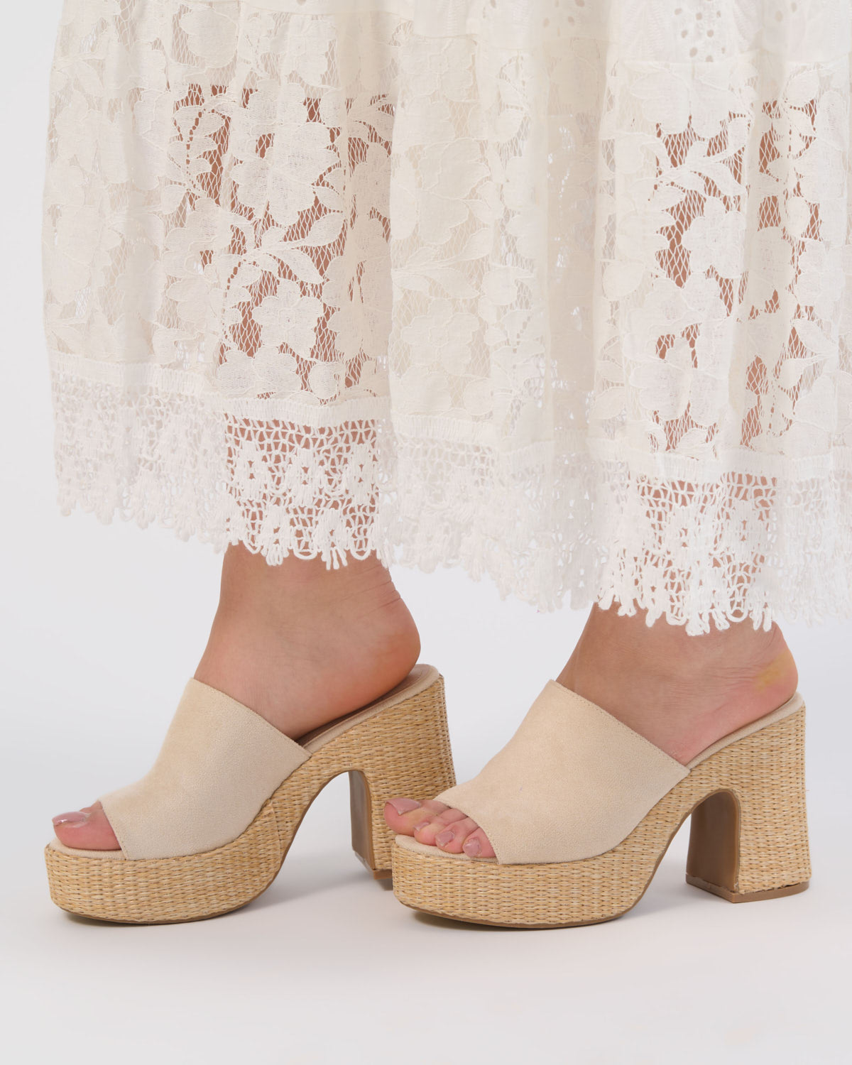 Tomaia in eco-camoscio morbido e plateau in paglia/rafia.