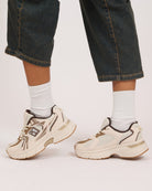 Scarpette in ecopelle e tela color beige chiaro con dettagli che sfumano tra marrone e kaki. Il plateau, alto circa 2-3 cm, garantisce comodità e una calzata equilibrata in ogni passo.