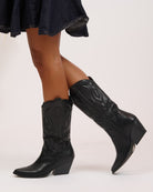 Stivali modello camperos con rifiniture cucite lungo il gambale.