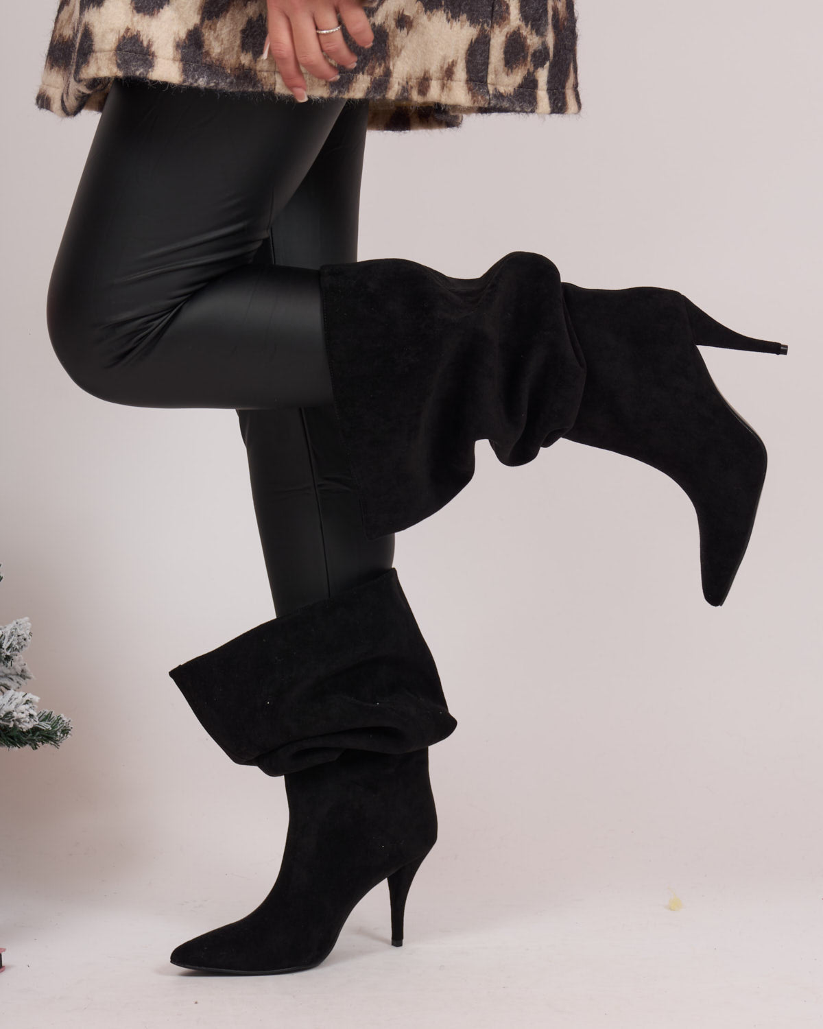 Stivali scamosciati con bordo largo, tacco a spillo comodo alto circa 8 cm.