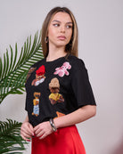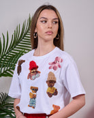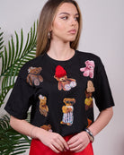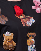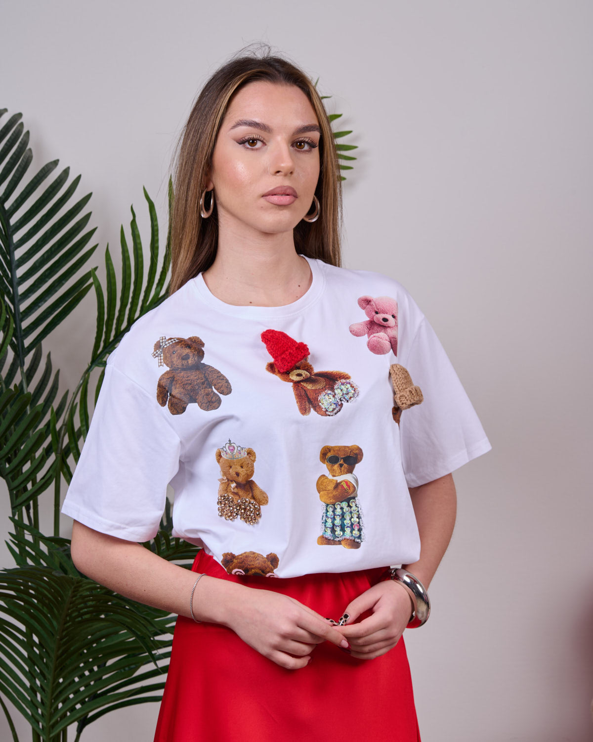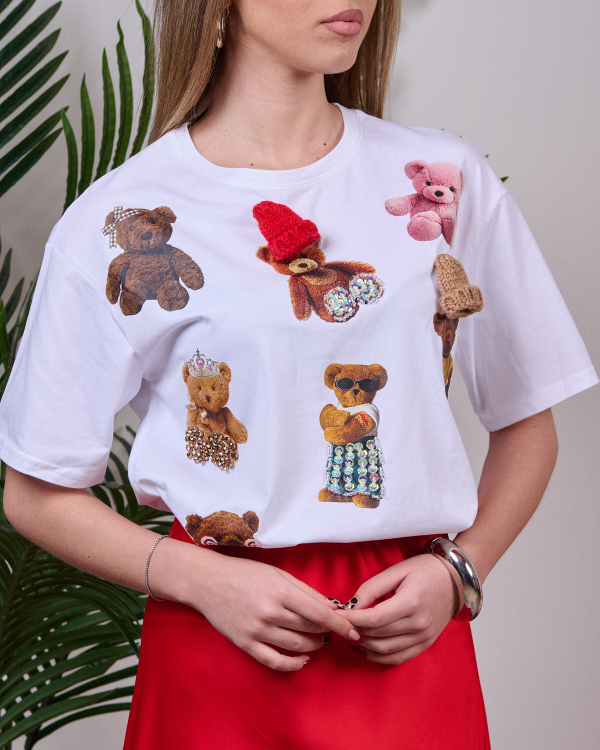 Maglia mezza manica girocollo con fantasia orsetti stampati sul davanti e dettagli in rilievo.