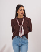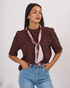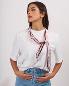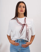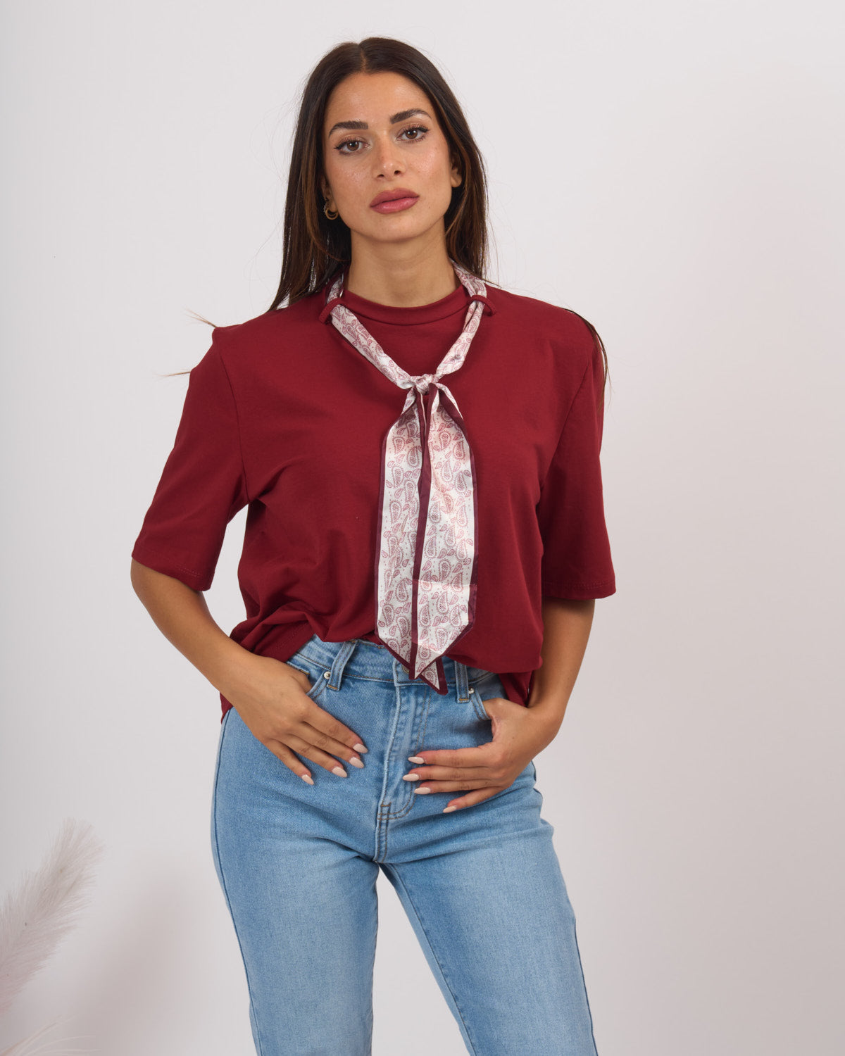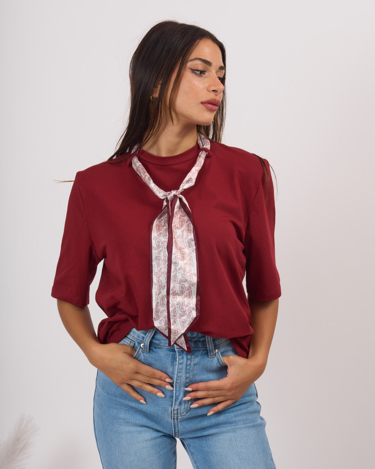 Maglia in cotone elasticizzato, mezza manica con foulard incorporato.