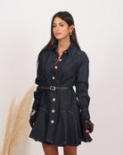 In denim lavaggio scuro con balza sul fondo, bottoni gioiello.