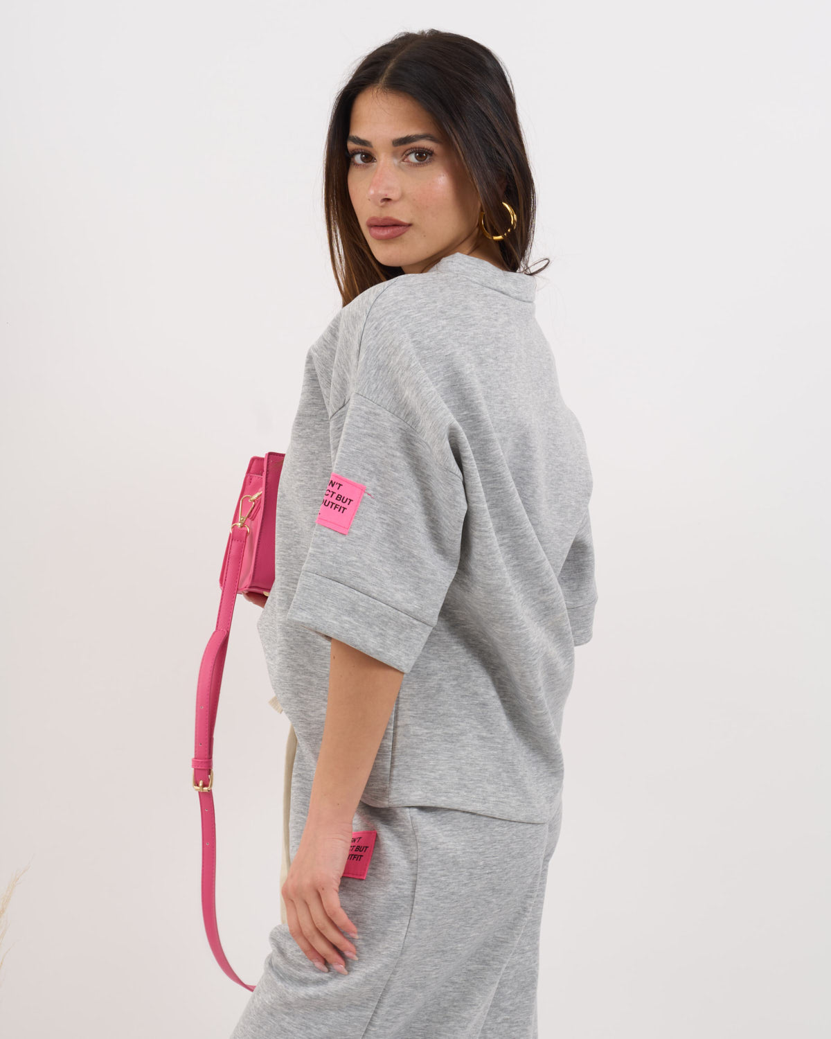 Coordinato composto da maglia girocollo con pantalone alta vita elasticizzata con lacci regolabili. Con patch di cotone cucita.