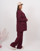 Tailleur doppiopetto composto da giacca modello oversize con interno foderato e spalline, pantalone vita alta con retro elasticizzato e gamba dritta fino al fondo.